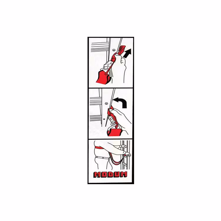 Skylt med instruktioner för Modum säkerhetssele.Mått: 65x240 mm.