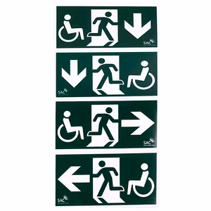 Rullstolspiktogram till SAC-LEAD-LEDDet är ett kit bestående av gubbe och rullstol med pil höger, pil vänster, pil ner och pil ner spegelvänt.