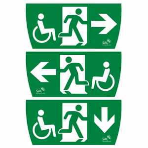 Rullstols piktogram passande SAC-Li-VEGA & SAC-Li-NOVA dubbelsidig armatur. Settet består av självhäftande piktogram med rullstol för montering på diffusor. Det består av rullstol med pil ner, pil höger och pil vänster.