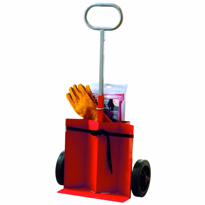 Housegard släckkärra godkänd för Heta Arbeten. Robust konstruktion med kraftiga hjul och teleskophandtag. Säljs även komplett med släckare.