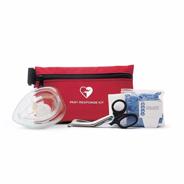 Pocketmask, sax, rakhyvel, skyddshandskar och kompress.