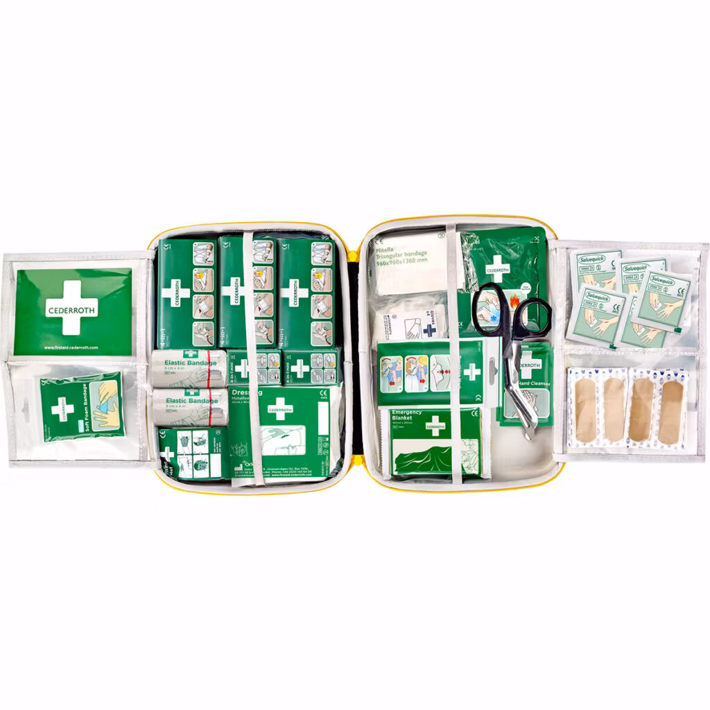 First Aid Kit Large är en välutrustad och praktisk väska innehållande produkter för sårvård, andning, cirkulation, brännskador och stukningar.