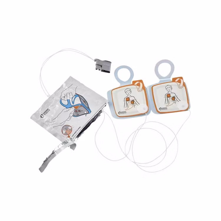 Elektroder till hjärtstartare Powerheart G5 från Cardiac Science. För användning på patienter under 8 år eller under 25 kg. Elektroderna kommer i en smart förpackning som förvaras i locket på hjärtstartaren. Paketet med elektroder byts snabbt och enkelt ut genom en kontakt. Elektroderna sitter fästa på varsin sida om en plastfilm. Piktogrammet på elektroderna indikerar med färg hur de ska sitta, båda elektroderna kan sitta på båda sidorna på patienten (icke-polariserade). Väl avtagna från plastfilmen är de är starkt vidhäftande för att sitta fast på patientens kropp.