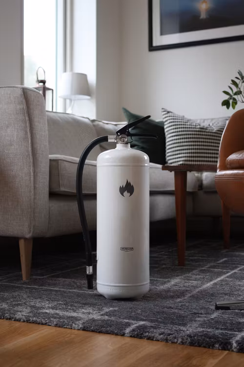 En designad 6 kg-pulverbrandsläckare som släcker alla typer av bränder och passar in i det moderna hemmet. Den vita brandsläckaren smälter in och blir en del av