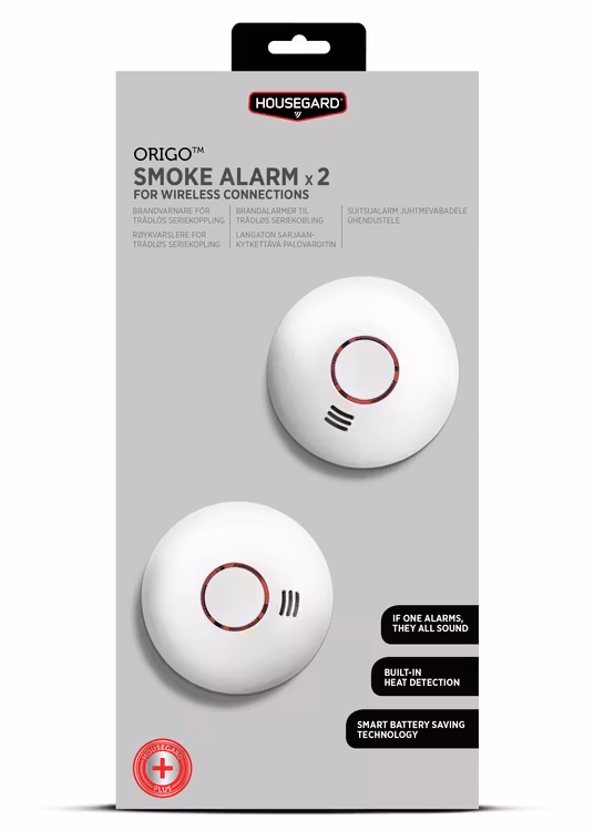 En brand utvecklas ofta snabbt och tidig varning kan vara avgörande. Om du trådlöst kopplar ihop alla brandvarnare i hemmet så blir du varnad oavsett var branden startar. Housegard Origo är den nya generationens smarta brandvarnare. Origo är en trådlös, seriekopplingsbar kombinerad rök- och värmevarnare. Housegard Origo använder den allra senaste energibesparande teknologin vilket ger upp till 12 månaders batteritid med endast 2 st AA-batterier.
