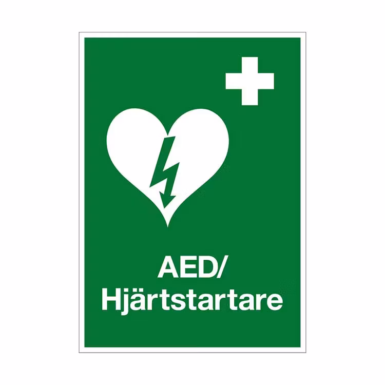 Nödskylt för AED / hjärtstartare. Tillverkad i tålig Apet plast. Storlek: A4 (210x297mm), A5 (148x210mm).