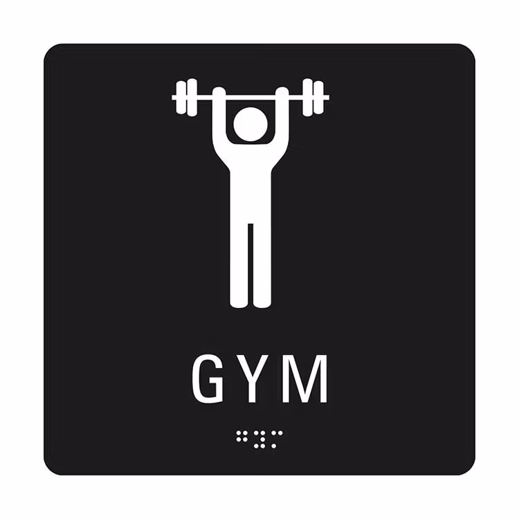 Taktil skylt: Gym. Levereras med dubbelhäftande tejp på baksidan för enkel montering.
