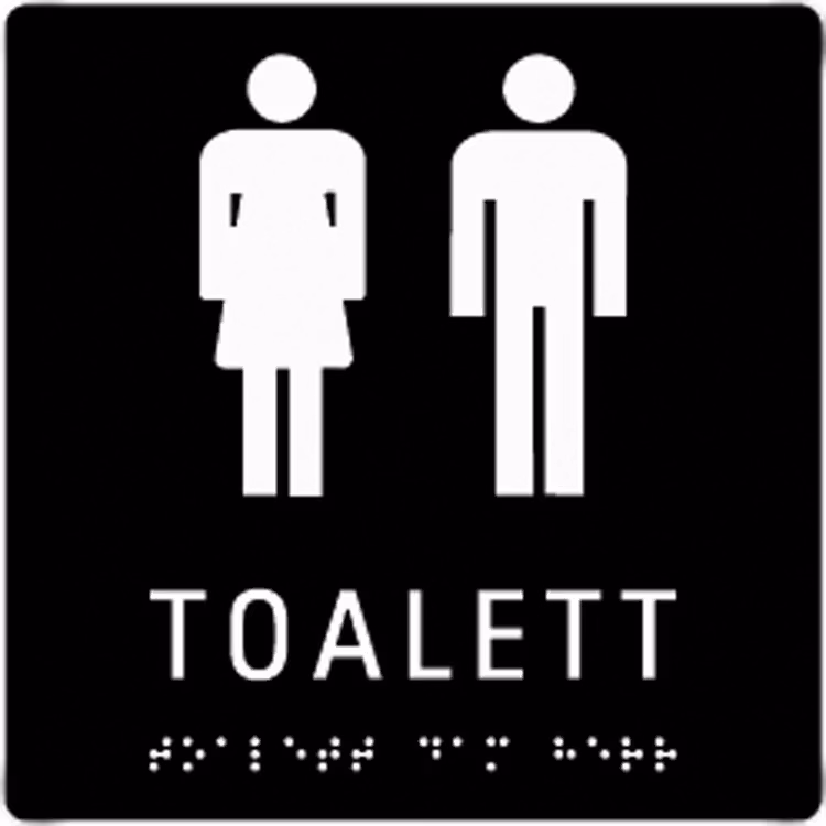 Taktil skylt: Toalett Dam Herr. Levereras med dubbelhäftande tejp på baksidan för enkel montering.