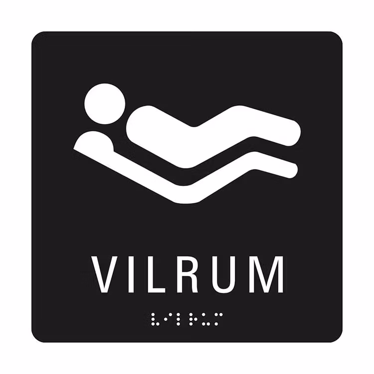 Taktil skylt: Vilrum. Levereras med dubbelhäftande tejp på baksidan för enkel montering.